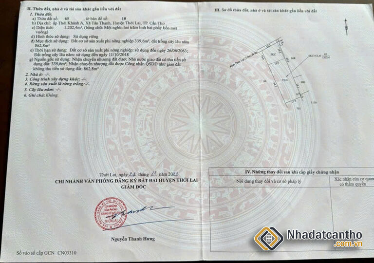 - Diện tích sử dụng 1,202 m2, trong đó diện tích đất CLN là 863 m2, diện tích đất SKC là 339 m2